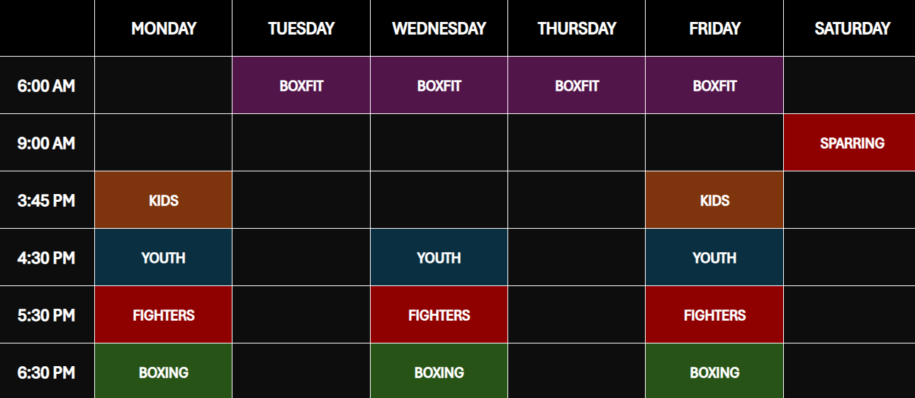 We offer a variety of classes designed to suit all ages and skill levels, including Boxfit, Kids Classes (10-12), Youth Boxing (12-16), Amateur Boxing, and Corporate Boxing.